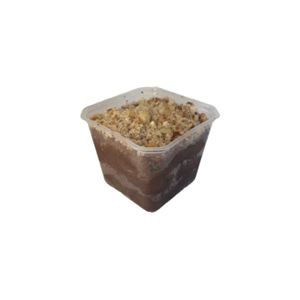 Nosso bolo de pote de cacau com recheio de brigadeiro e nozes é uma combinação irresistível. As nozes picadas adicionam crocância, e o aroma de cacau desperta os sentidos, proporcionando uma experiência indulgente em cada camada.